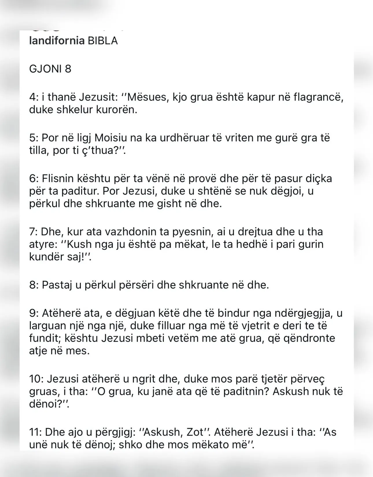 Në mes të kritikave dhe gjykimeve publike, reagimi i mikut të tij të afërt, Landit, mori një tjetër drejtim. Ai zgjodhi të ndajë në rrjetet sociale një citat nga Bibla (Gjoni 8):